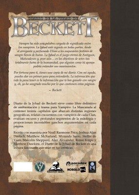 Diario de la Jyhad de Beckett sirve como libro definitivo de ambientación y trama para Vampiro: La Mascarada al contener treinta capítulos que abarcan distintas regiones geográficas, relatan encuentros con vampiros de cada Clan, evalúan oscuros y profundos segmentos de la mitología y proporcionan incontables ganchos argumentales en cada página.
